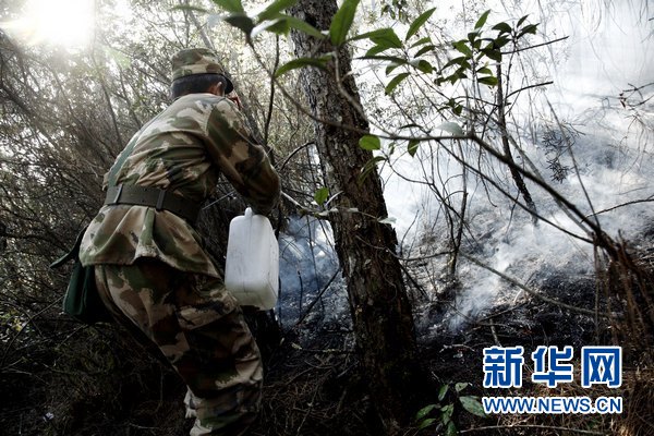 资料图片:3月1日上午,武警云南总队丽江支队的官兵在过火林区扑灭余火。新华社发(杜海涛 摄)