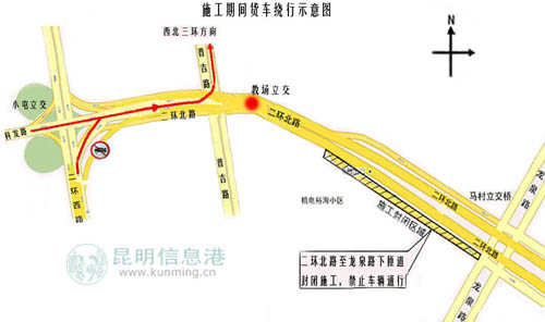 昆明二环快速系统马村立交西向东下行匝道,2011年3月11日至2011年4月11日期间封闭施工,需要行经该路段的外廓尺寸超过2.5米的机动车辆及货运机动车辆可通过普吉路、西北三环、金色大道、北辰大道等道路绕行。需要行经该路段的小型机动车辆可通过教场路、金星立交等道路绕行。