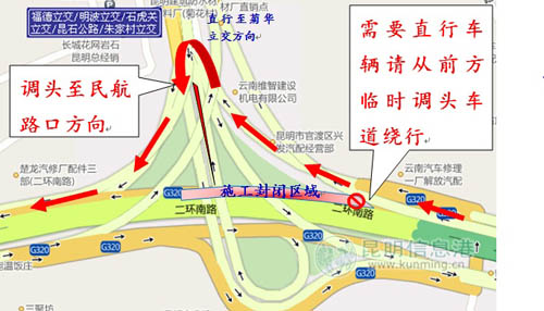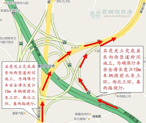 昆明二环快速系统石虎关立交底层东向西匝道临时封闭施工将于2011年3月11日至2011年4月11日实施全面施工,需要通过该路段长度超过10米的机动车辆可通过朱家村立交、东三环路、西北三环、春雨路等道路绕行。长度小于10米的机动车辆可通过东二环底层道路的临时掉头车道进行绕行。