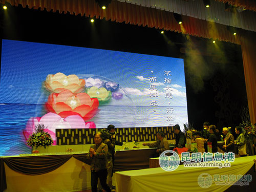 4月5日清明节当天,位于昆明市嵩明县境内的云南长松园陵园举行千人祭扫活动,倡导无烟无火文明环保祭祀。用高科技声、光电的艺术手段,让送别亲人的悲痛,在身临其境的音乐、艺术环境中最大程度化解和减轻。人性化设计,用投影方式制作不同的告别场景,制作电子花圈,减少对纸张的浪费,环保节约。图为千人祭扫大厅。昆明信息港记者韩焕玉/摄