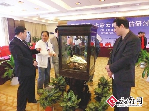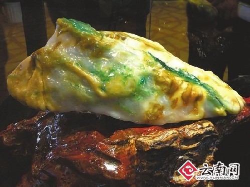 日前,翡翠原石“七彩云南”评估研讨会在腾冲举行。会上,中国工艺美术学会副会长兼秘书长、中国工艺美术馆原馆长赵之硕代表专家组对“七彩云南”给出评价:七彩宝玉,旷世罕见。翡翠原石“七彩云南”毛重13.8千克,形状奇特,黄皮包裹。原石剥皮后,净重9千克,长36厘米,宽13.9厘米,厚15厘米,呈现黄、青、蓝、紫等7种色彩。(记者 朱丹 通讯员 马宝忠)