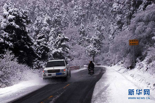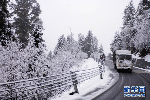 5月2日,车辆在川藏公路西藏林芝地区鲁朗镇境内积雪的道路上缓慢行驶。当日,川藏公路西藏林芝地区鲁朗镇境内突降大雪。川藏公路鲁朗至色季拉山山顶20余公里路段出现道路积雪。 新华社记者 袁晔 摄