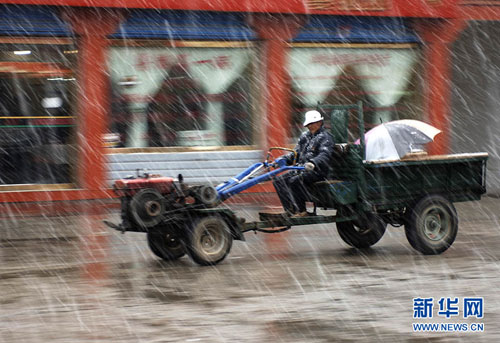 5月2日,一辆手扶拖拉机行驶在川藏公路西藏林芝地区鲁朗镇的街道上。当日,川藏公路西藏林芝地区鲁朗镇境内突降大雪。川藏公路鲁朗至色季拉山山顶20余公里路段出现道路积雪。 新华社记者 文涛 摄