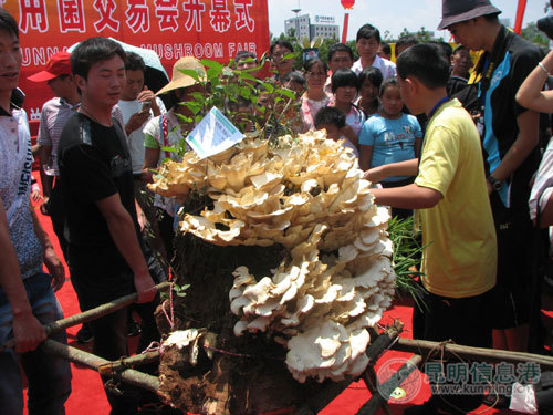 开幕式结束后,众人期待的菌类商品拍卖会就开始了。在所拍卖的菌子中一朵形似云朵的平菇盆景吸引了众人的目光,只见在一棵树桩上结出几十朵云朵状的平菇。“昆明的专家给我的这个菌子定名为‘侧耳(平菇)野生菌树桩盆景’。”李开福的“侧耳(平菇)野生菌树桩盆景”最终荣获“菌王”殊荣。