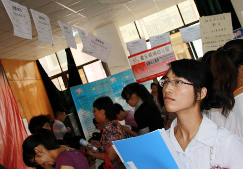 2011年8月2日,昆明市民办教育服务中心,2011年昆明市民办教育活动月校(园)长、教师招聘会今天举行,本场招聘会主要针对幼儿园校(园)张、教师的专场招聘,图为应聘者在仔细阅读招聘信息。 实习记者 李海曦摄