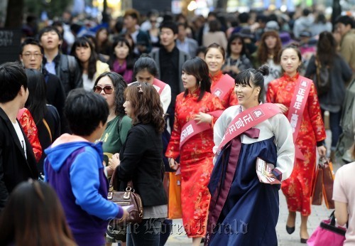 韩国商家促销团队着中国传统服装旗袍吸引现场大批中国游客的目光。