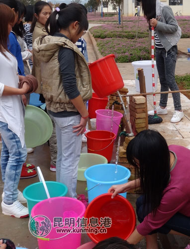 目前,曲靖师范学院有全日制本专科在校生13500余人,另有函授、电大、网络教育在籍学生1万余人,在职教职员工874人。学校宿管科工作人员表示,宿舍区地势太高,水压不够,水根本输不上来。为了保证学生用水,学校临时在各个绿化带安装了水管供学生取用。现在干旱仍在持续,他们也不知道什么时候才能恢复正常用水。