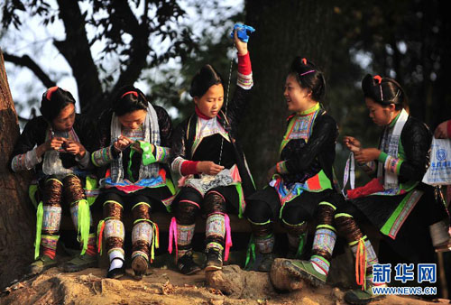 11月17日,岜沙女子聚在一起刺绣。岜沙女子会用1至3年的时间精心制作自己的嫁衣。