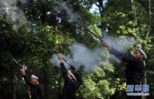 11月17日,岜沙汉子鸣枪迎接进入部落的客人。新华社发(田卫涛摄)