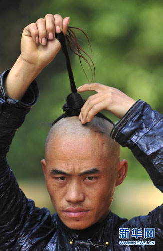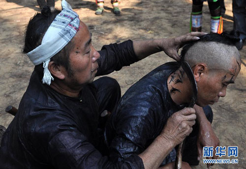 岜沙男子到了18岁时会把头发扎成辫子绑于头顶,称为“户棍”,终生保留,四周的头发会剃光。据说这是迄今为止中国所能见到的最古老的男性发式(2011年11月16日摄)。新华社发(田卫涛 摄)