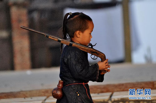 11月17日,一名岜沙儿童持枪行走在村落里。新华社发(田卫涛摄)