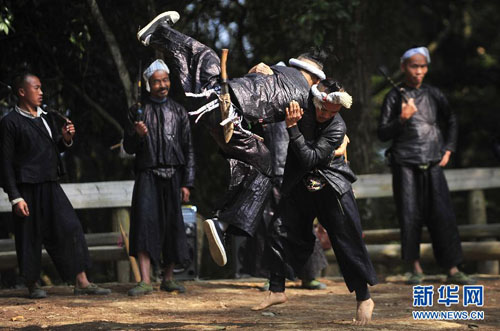 岜沙人在表演婚恋习俗,岜沙汉子从娘家人手中抢过“新娘”(2011年11月16日摄)。新华社发(田卫涛摄)