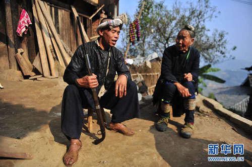 岜沙汉子肩上扛枪,犀利的目光中透出自信(2011年11月17日摄)。新华社发(田卫涛摄)