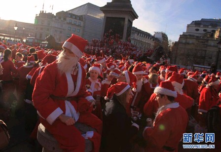 在英国伦敦的特拉法加广场,数百人身穿圣诞老人服装聚集在这里,参加“圣诞老人聚会”。 新华社/路透