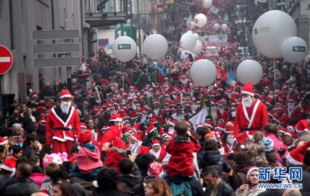 在葡萄牙北部城市波尔图,人们装扮成圣诞老人参加游行。当日,数千民众在波尔图市中心举行圣诞老人大游行,试图打破最多圣诞老人参加游行的世界纪录。新华社记者 童炳强 摄