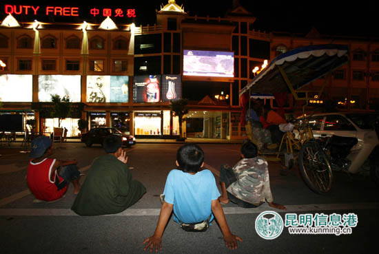 瑞丽口岸,缅甸的孩子晚上经常过境来中国看大屏幕上的电视节目 都市时报 首席记者龙宇丹/摄