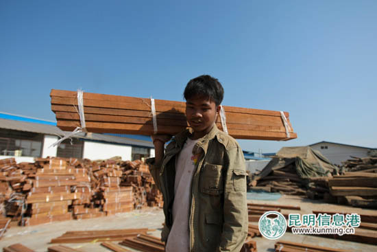 在瑞丽一家木材企业搬运木料的缅甸籍工人 都市时报 记者曲鸣飞/摄