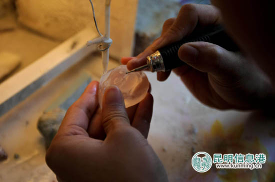 23岁的江苏小伙吴存刚已经在珠宝街奋斗了6年,他已由一个学徒变成了娴熟的珠宝雕刻艺人,有了一个10平方米的门店。学艺3年,雕刻3年,让他看起来很是成熟。但在他看来,自己仍是一个学徒。“珠宝雕刻不仅靠学,还得有艺术天赋,不然再好的玉在你手上也成不了精品。”