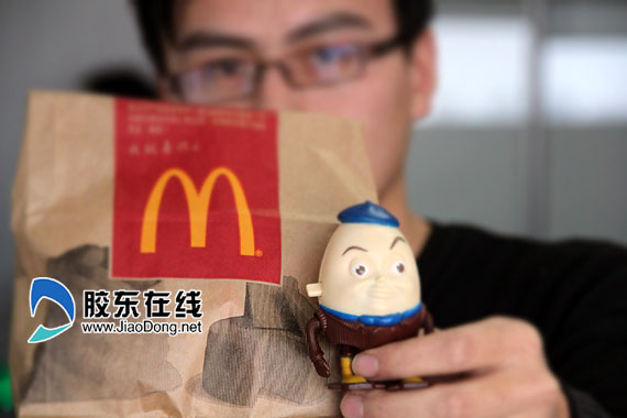 麦当劳套餐捆绑销售儿童玩具!11日,烟台市民刘女士联系本网记者称,她带着儿子去麦当劳观海路餐厅就餐,两人点了麦香鱼套餐和鸡腿堡等食品,餐厅收银员在没有告知刘女士的情况下,收取了10元的玩具费,并在餐袋里放了一个称之为“蛋头小子”的玩具。