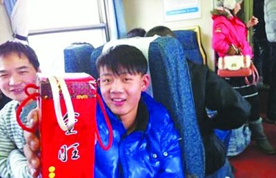 车厢里的热闹喧哗,掩盖不了文成明明媚的笑脸。这个18岁的大男孩,一边拎着给爷爷带的保温杯,一边手舞足蹈地向父母叙述他的“宏伟梦想”。“看,给爷爷带的保温杯!”看到记者来了,文成明向记者“秀”起了他的礼物,“奶奶去世了,现在家里就爷爷一个人。爷爷年纪大了,不能出门,我们这次回去,就是去跟爷爷团聚过年!”文成明说,爷爷前段时间感冒,随时都想喝点热水,所以他就给爷爷带了个保温杯,让爷爷出了门也有热水喝。