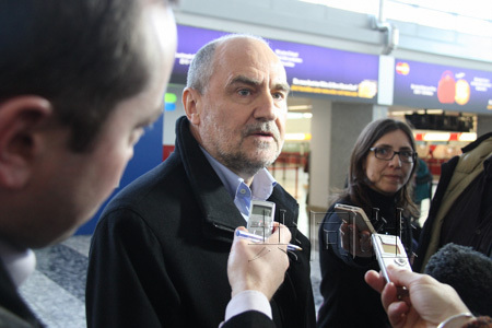 1月28日,率领高级调查团的国际原子能机构副总干事纳克茨动身前往伊朗前在维也纳机场接受采访。(共同社)