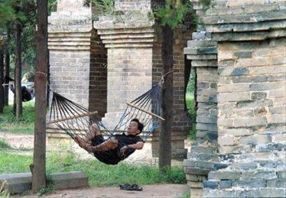 在少林寺塔林景区内,一名工作人员躺在一张吊床上酣睡 新华社发