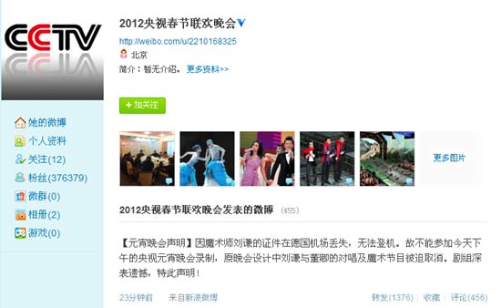 原计划在央视元宵晚会与董卿对唱的刘谦,据央视春晚官方微博宣布,因其证件在德国机场丢失,无法登机,故不能参加今天(5日)下午的央视元宵晚会录制,原晚会设计中刘谦与董卿的对唱及魔术节目被迫取消。