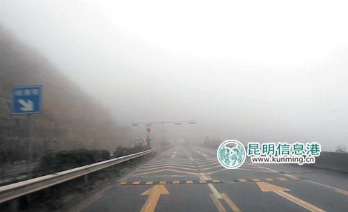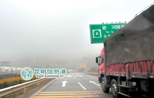 穿过那楼隧道后,很快又到了岩河隧道。岩河隧道是一道分水岭,进隧道前,驾驶者的视野还十分开阔;但出了隧道,周围就突然变得浓雾弥漫,能见度降到不足50米。道路的坡度逐渐增大,弯道增多,路边“事故多发路段”、“前方有强制减速带”等提示牌随处可见。路上设有强制减速带,车辆纷纷减速。仔细看,公路上还留着许多因事故损坏的痕迹。一些车辆残骸被放置在路边,个个面目全非、破烂不堪。这是用来警示驾驶员的。客车司机一只手紧紧握住方向盘,一只手不停地擦拭挡风玻璃上蒙起的雾气,同时把车速放慢到50公里/小时左右。
