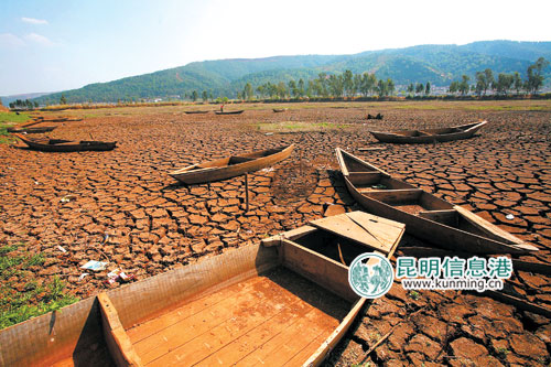 由于三年连旱,作为珠江水系南盘江支流的河源——红河州石屏县赤瑞湖也未能躲过“劫难”,彻底干涸见底并呈现出了龟裂状。其下游的云南第四大湖泊异龙湖的蓄水量也只有丰水期的三分之一,湖里许多小鱼都已经干死。