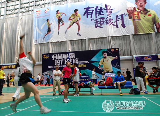 昆明信息港讯 记者戴兴 今天上午,“羽林争霸”2012红牛城市羽毛球赛云南赛区昆明站的比赛在国际会展中心威克多羽毛球馆正式开拍,本次比赛共吸引了54个业余队近400位羽毛球爱好者的积极参与。进过一整天的角逐,最终16支球队晋级第二阶段的比赛。