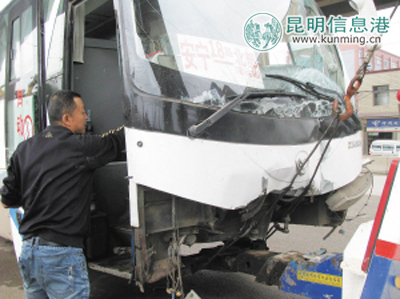 昨天上午10点左右,记者在碧鸡路乐海车市门口看到,一辆从安宁开往北部客运站的18路公交车,停靠在二环高架桥的桥墩旁,车前的挡风玻璃被撞成蜘蛛网的形状,车头下部分面目全非,被撞烂的部件散落了一地,公交车内的投币箱也斜倒在车门口,几名工作人员正要把公交车拖走。