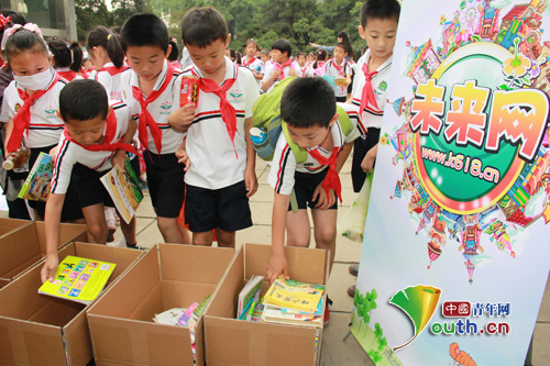 活动现场,未来网发起“2012手拉手捐书行动”,向社会各界发出倡议,为200所贫困山区中小学校捐助200个“未来书屋”,并现场组织北京万泉小学、首都师范大学附属小学、北苑中学、蓝天幼儿园以及参加活动的作家和小明星,向中国儿童福利示范区项目所在地的4所中小学校对口捐助近万册图书和光盘。