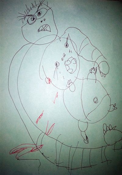 家暴事件后,在三个孩子们的图画中,总出现龇牙咧嘴、眉头紧蹙的眼镜男。画里的孩子都是哭的,流着大滴大滴的眼泪。