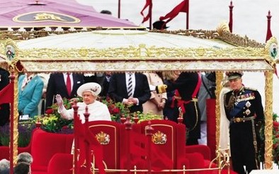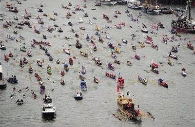 6月3日,作为庆祝英国女王登基60周年的“重头戏”,千船巡游在泰晤士河上演。英国夏令时间14时40分(北京时间21时40分),英国女王伊丽莎白二世与其夫君菲利普亲王,查尔斯王储及其妻子卡米拉,威廉和凯特夫妇以及哈里王子等王室成员乘坐“查特维尔精神”号游船,与来自世界各地的各种船只一起组成7英里(1英里约合1.61公里)长的船队,由巴特西桥出发,前往终点塔桥。