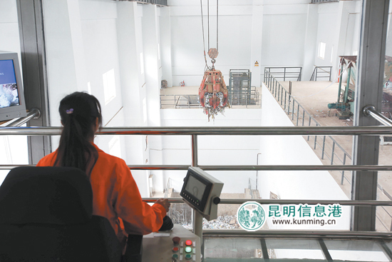 操作间内,工作人员正将危险废物吊离垃圾堆,进行进一步处置 记者 孟祝斌