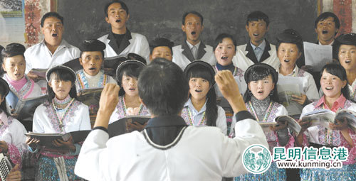 同行的安宁市文联副主席余松涛介绍,苗族天生有一副明亮高亢的独特嗓音,歌声起落变化很大。由于普通乐器的音阶不足以完全表现苗族歌声的婉转,所以他们喜爱用二胡和提琴做伴奏,或许正因有如此的和声和美声,这些相对复杂的唱法在村民们看来却很容易掌握。