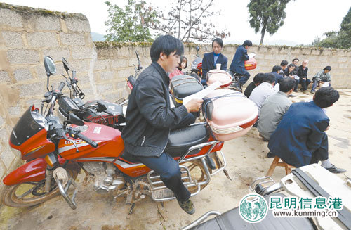 每到周末,合唱团成员便会从四面八方赶来排练,先到的成员坐在摩托车上熟悉旋律。黄晓松/图