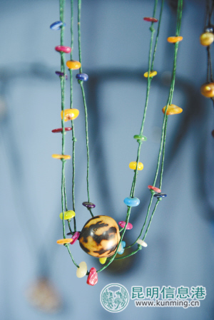 废旧的电线被做成了项链、易拉罐的拉环变成了耳环,旧纽扣装点成了戒指,看起来平淡无奇的棉麻布演变成了布艺包,还有一颗颗小玻璃串成的手链。