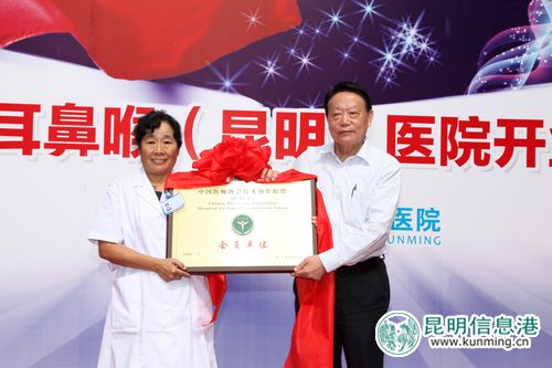 昆明信息港讯 记者纳娅 29日上午,云南首个耳鼻喉专科医院——康生耳鼻喉(昆明)医院隆重开业,中国健康教育协会会长、中国医师协会会长、中国医师协会技术协作联盟主席殷大奎出席了开业仪式并致辞,他表示,鉴于康生耳鼻喉(昆明)医院的规模和实力,中国医师协会技术协作联盟吸纳其成为会员单位。开业庆典上,殷大奎主席进行了现场授牌。