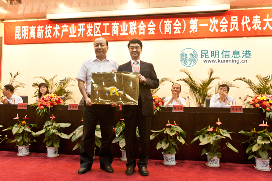 昆明市委常委、市政法书记、高新区建设指挥部指挥长金志伟为新当选的高新区工商联主席、会长授牌。市委常委、高新区党工委书记、管委会主任董保同主持大会,昆明市委常委、统战部长熊瑞丽在会上讲话。