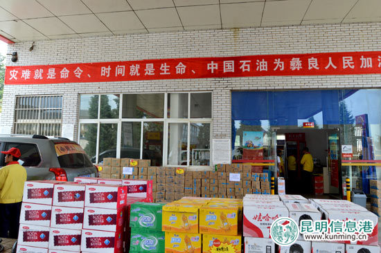 各站点悬挂救灾横幅,准备了饮用水等免费赠送给救援车辆。昆明信息港记者林坚/摄