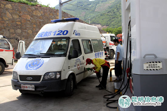 中石油彝良加油站在为抗震救援医疗车辆供油。昆明信息港记者林坚/摄