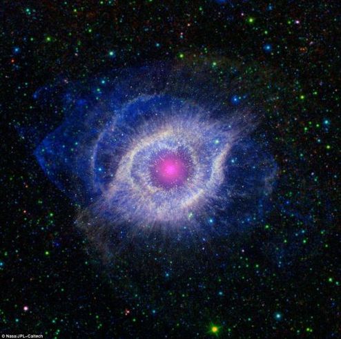 这张合成图是由美国宇航局的斯皮策太空望远镜和星系演化探测器(GALEX)拍摄的,该局把这些仪器借给帕萨迪纳的加州理工学院。这个名叫菲力可斯星云的天体位于距离地球650光年的宝瓶座里。它的编号是NGC 7293,是行星状星云的一个典型例子。18世纪发现的这些宇宙艺术品因为类似庞大的气体行星,所以一直被错误命名。行星状星云实际上是曾经看起来很像我们的太阳的恒星的残余物。这些恒星一生中的大部分时间都在通过核内失控的核聚变反应,努力把氢转变成氦。事实上,我们的太阳正是通过这种核聚变过程为我们提供光和热。我们的太阳在未来大约50亿年内走向死亡时,也会变成一个行星状星云。