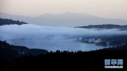 这是11月5日在安徽省黄山市黟县塔川村拍摄的平流雾景观。当日清晨,安徽黄山脚下的黟县塔川村雨过天晴,出现平流雾美景,层叠林立的徽派民居被轻雾缠绕,若隐若现,美丽秋色宛如仙境。新华社发(施广德/摄)