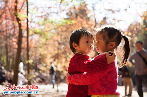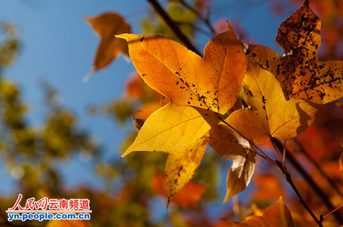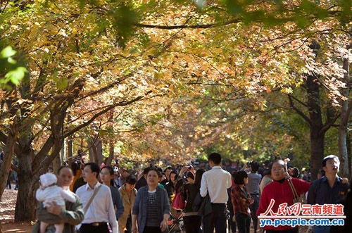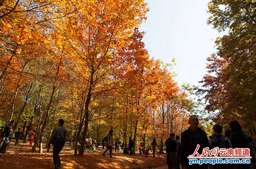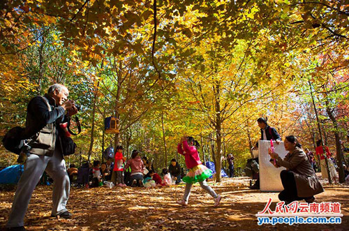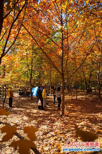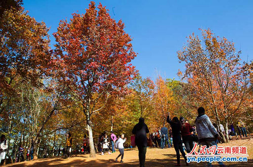 昆明植物园“火红”枫叶照亮春城 吸引市民前往观赏