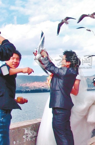 昨日,网友“荷塘那荷花”在彩龙论坛上晒出了一对新人在草海大坝拍婚纱照,新郎抓住一只海鸥与新娘合影的照片。“荷塘那荷花”在照片的文字说明部分称,照片拍于昨日下午2点20分,地点是海埂大坝(应为“草海大坝”)。