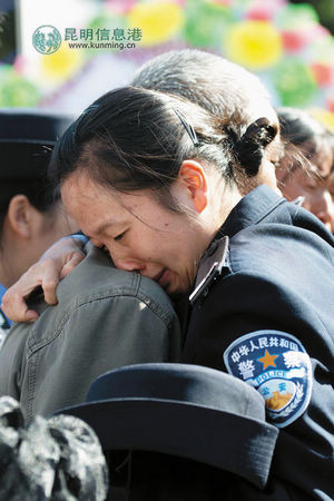 每年因民警枪支使用问题造成的民警伤亡事件,对家庭和社会带来巨大的伤害。这是在遗体告别仪式上,一名民警拥抱张建作的父亲。资料图片