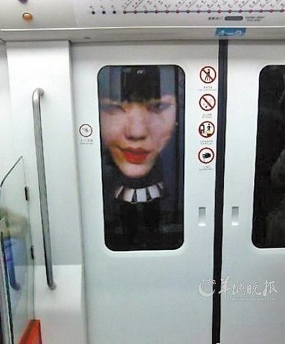 广告中,有吴莫愁大幅脸部特写照片,烈焰红唇极其夸张,双眼半睁半闭、左右大小不一、画着浓黑眼影。据悉,在珠江新城等多个地铁站也有此广告。此外,日前网友“尹卓男”在微博中也称“吴莫愁惊现于沈阳地铁门上,吓了乘客一跳”(如图)。