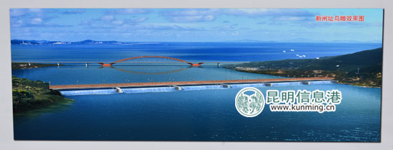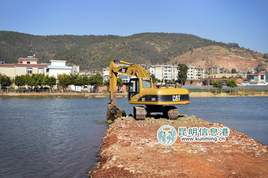 美丽的高海大桥下的滇池水面上,一辆推土机正在将围堰上的土方推向水中,不久的将来,这里将形成一道坚固的水闸。滇池外海水位调控枢纽(海口闸)工程建成后,可将防洪标准从20年一遇提高到50年一遇。