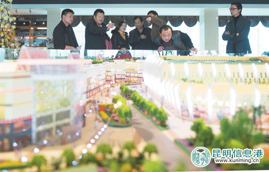 商家们在斗南国际花卉产业园规划模型前 记者马闪山/摄